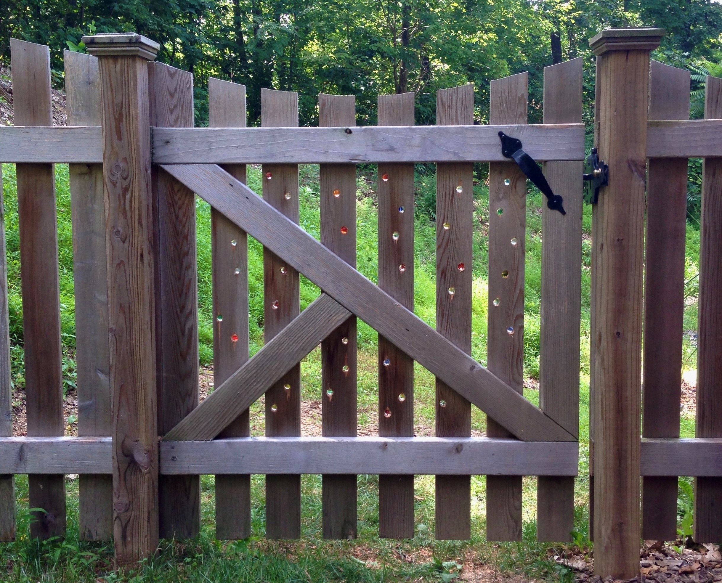 Custom fabricated steel framed wooden gate. Pickets are 1x6x6 cedar dog eared attached by welded plates. Privacy gate with Shadowbox fence at either side.
