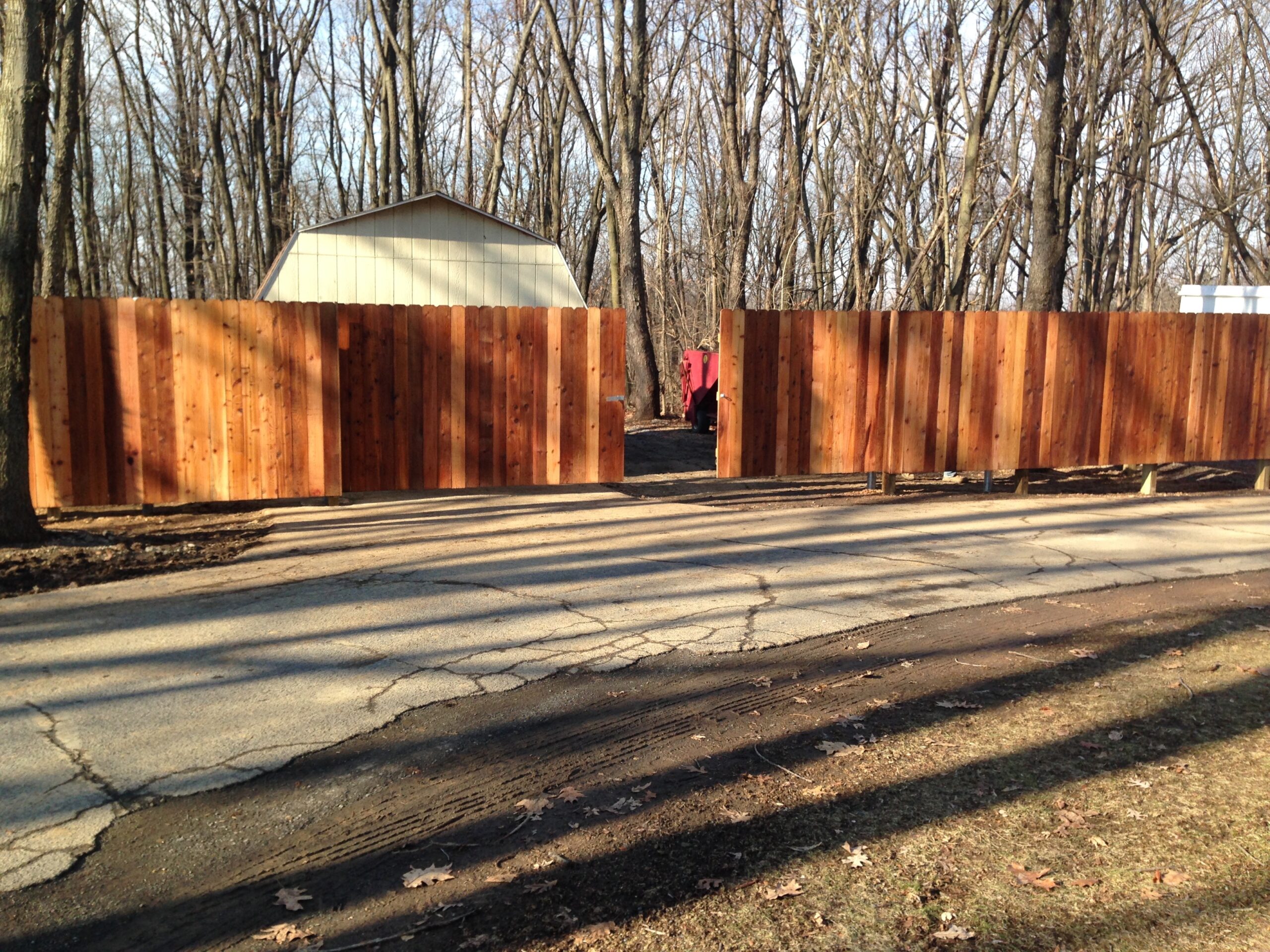 Custom fabricated steel framed wooden slide gate. Pickets are 1x6c6 dog eared attached with wood to steel adaptors.