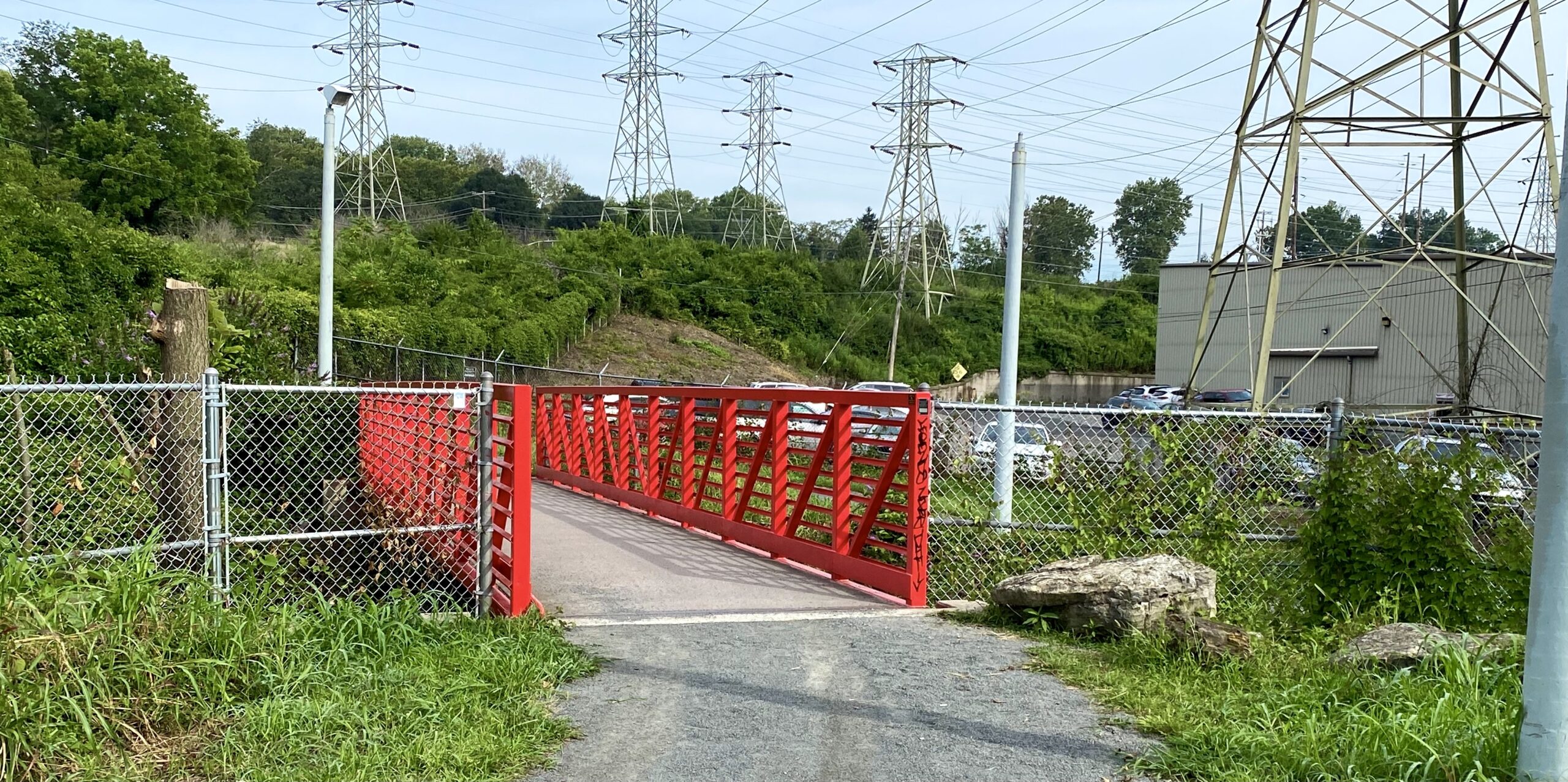 Mini red barrier gates with matching billiards at the Schuylkill River Trail Head on Old Wyomissing Road to block vehicle traffic on trial.