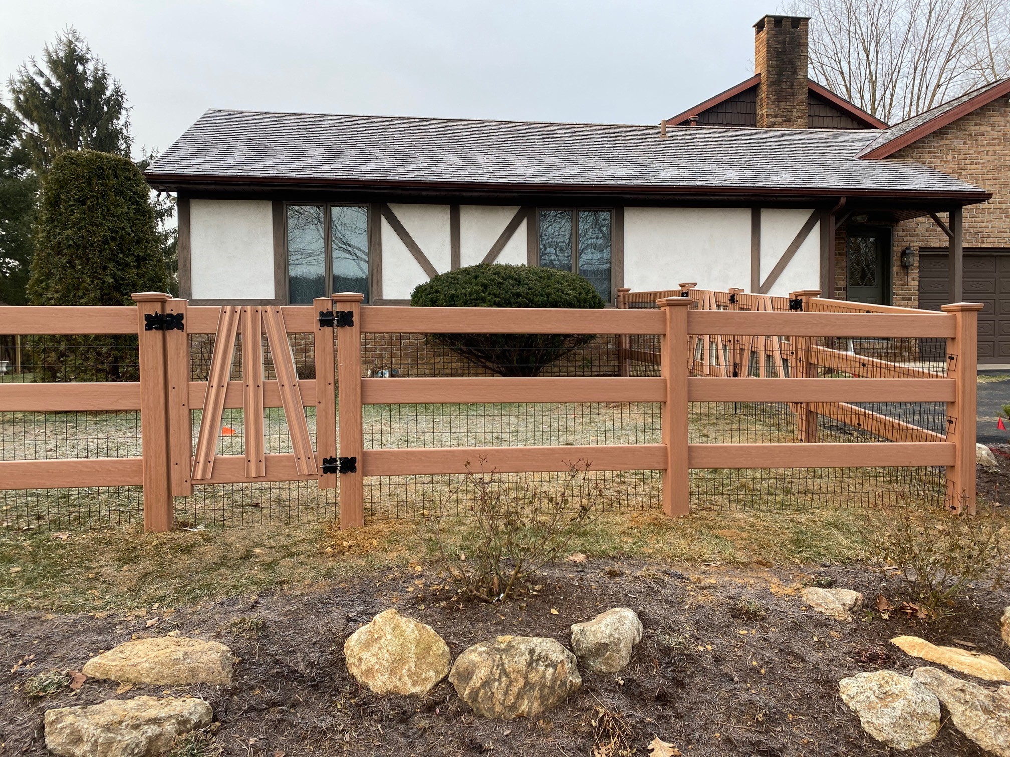 Style to resemble wood post and board. 4′ H 3 rail Sierra Blend shown. 5 wood tones available for 3 rail textured style.