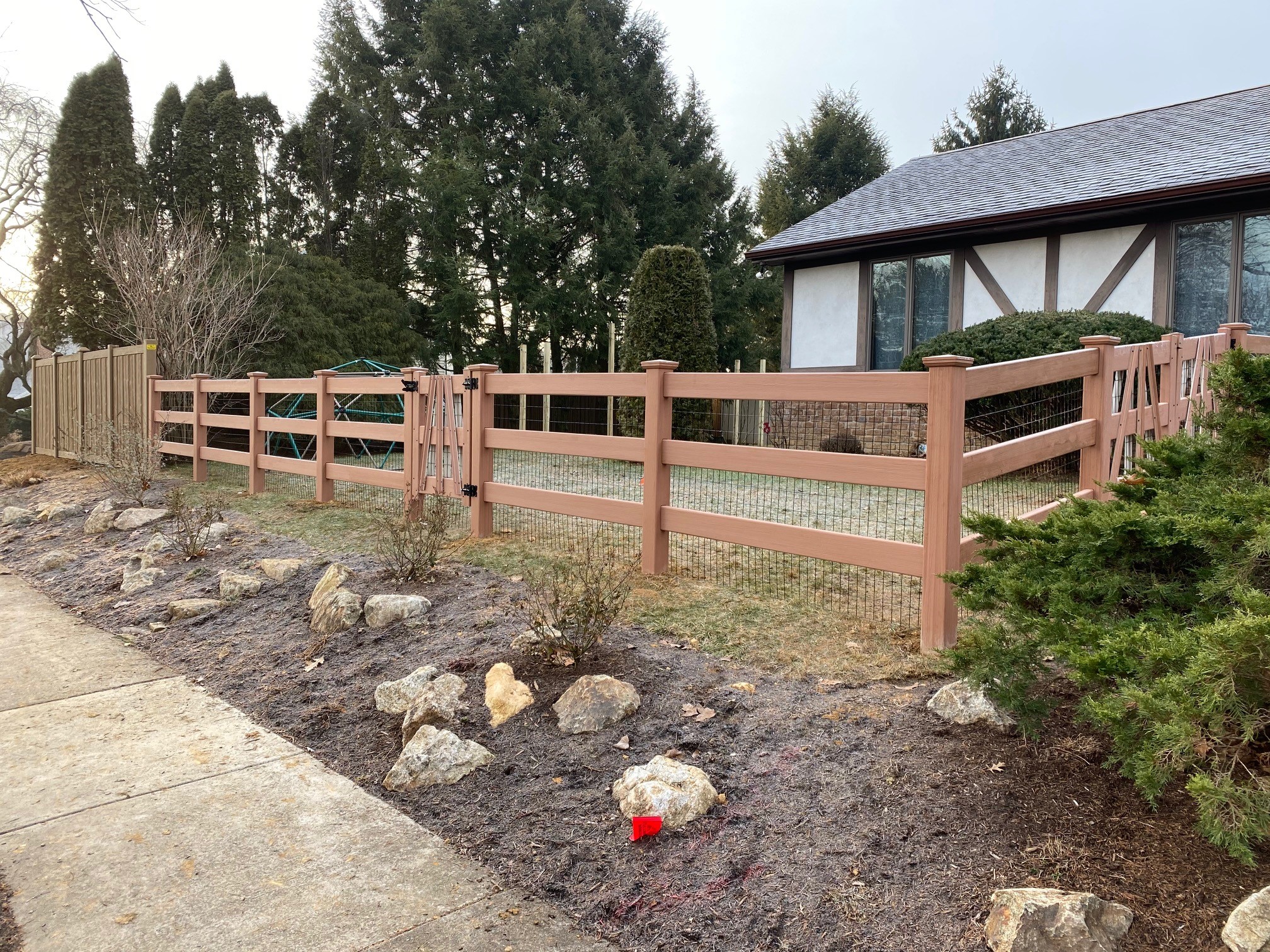 Mix between 6’H tan vinyl privacy and Regis 3230 style with flush bottom. Gives privacy from neighbors and also provides opening at the front of property.