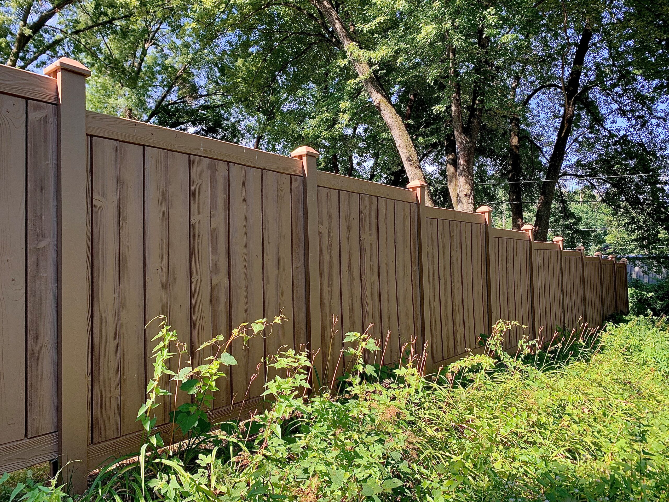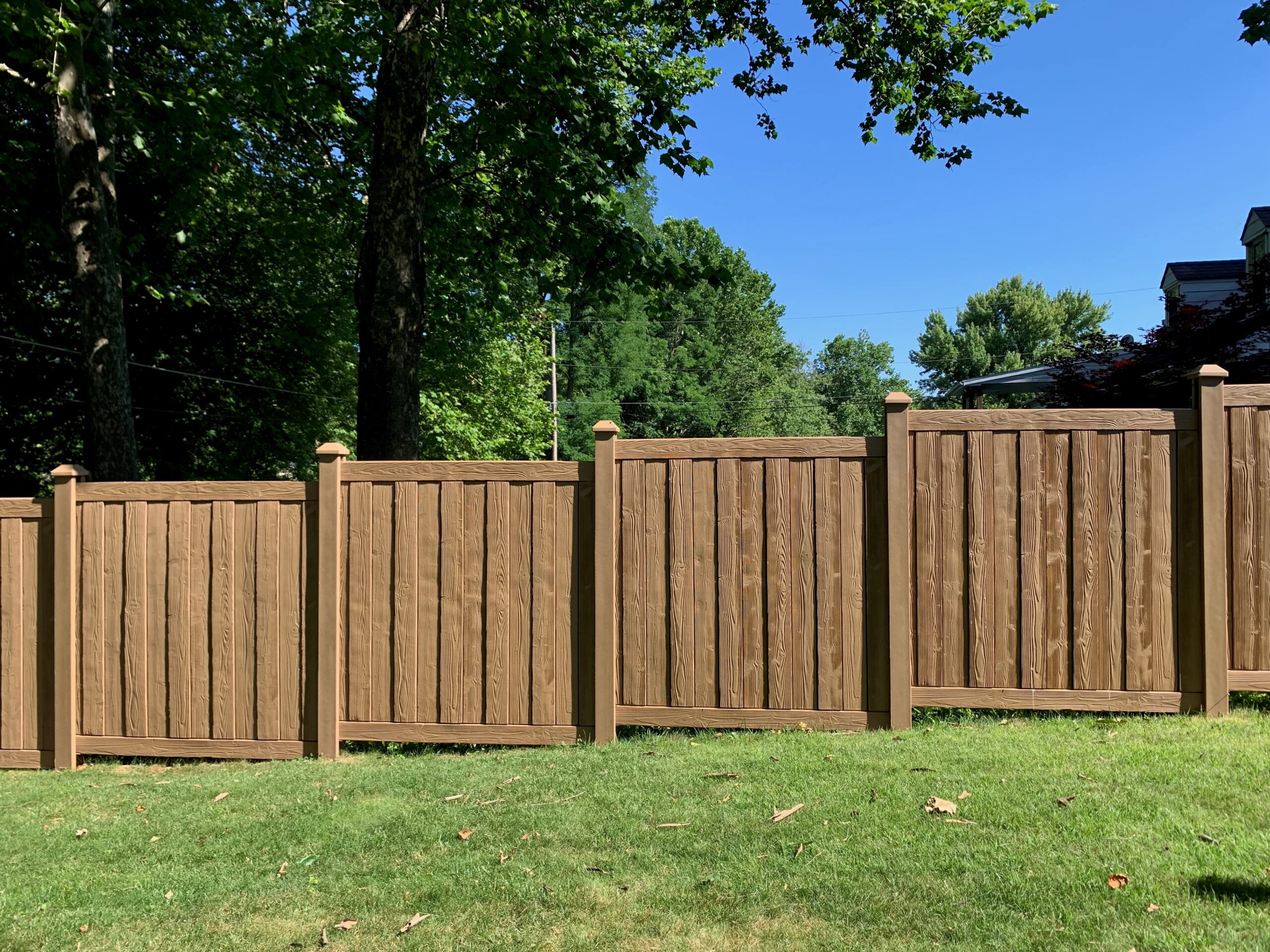 Privacy option for vinyl fencing, made to resemble a wooden fence but with the added benefit of being low maintenance. CertainTeed Sherwood style comes in walnut brown, red cedar, nantucket gray, black oak, and gold cedar (as shown).